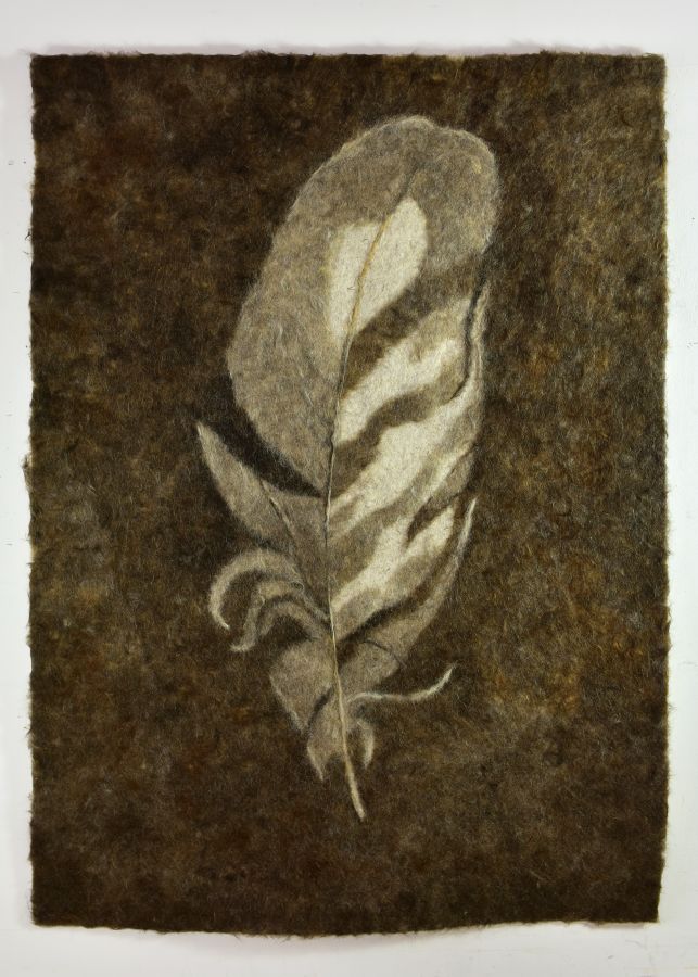 De drager is een vilten lap gemaakt van Scottish Blacface schapen. Daarop heb ik met mensenhaar een veertje afgebeeld: de 11-de armpen van een eerste jaars Sperwermannetje. Sterk uitvergroot, in het echt is het veertje 10,8 cm lang.