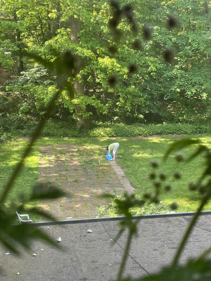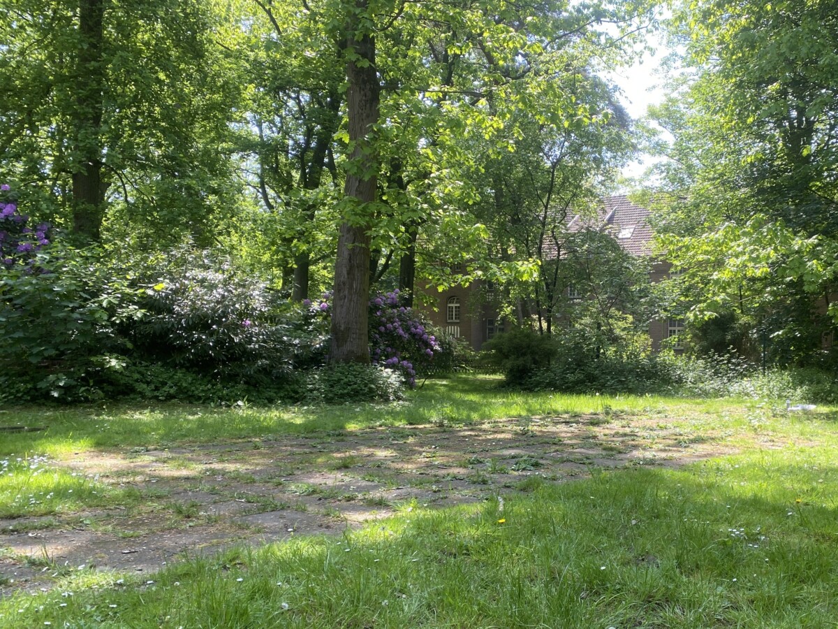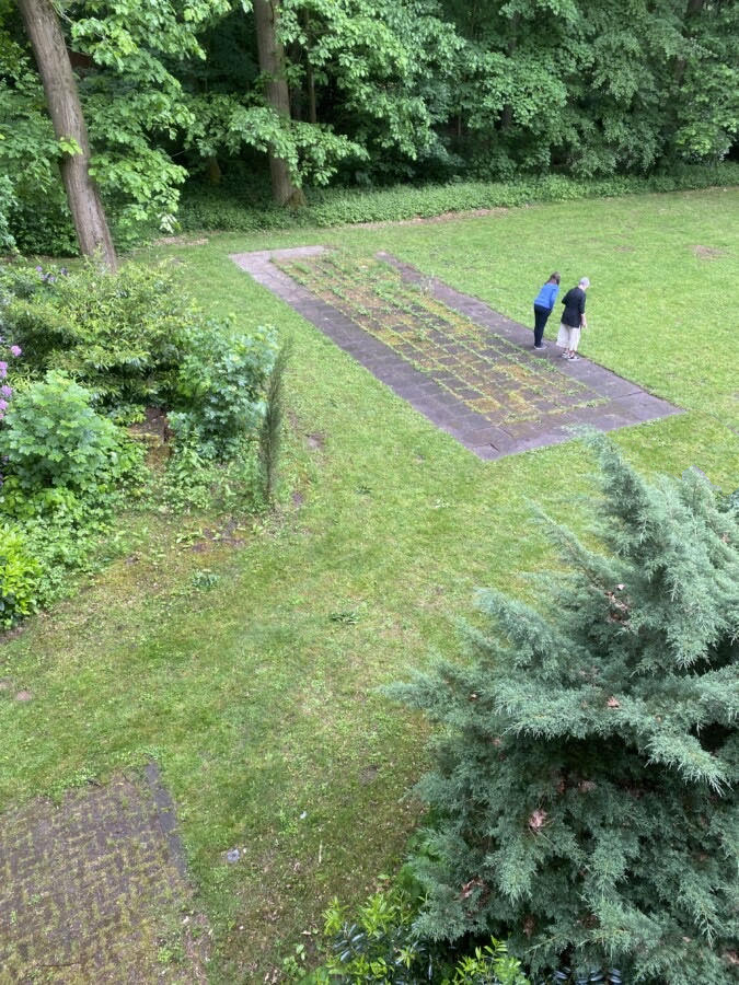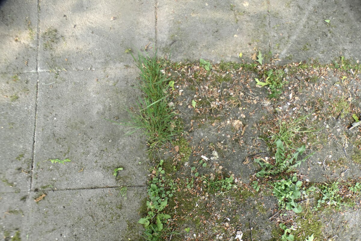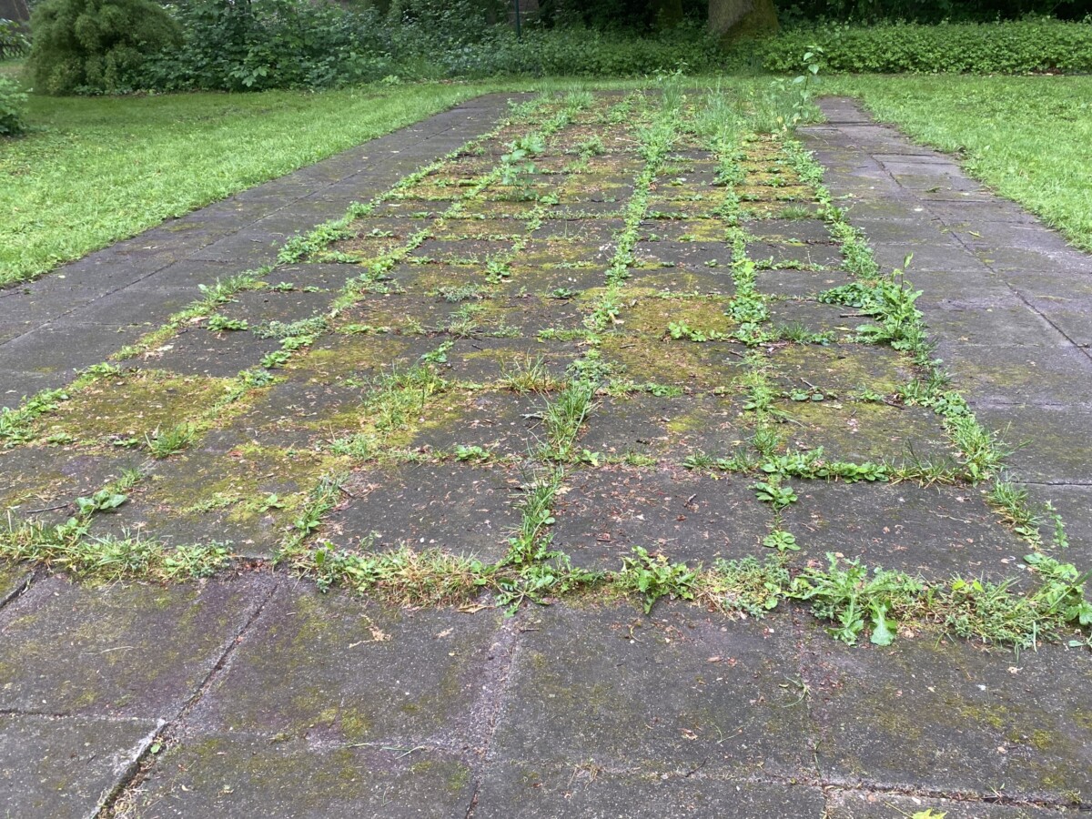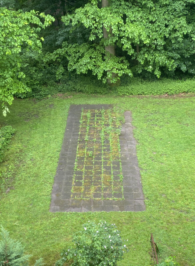 Ik wilde geen materiaal meenemen naar mijn artist in residency bij ArToll Kunstlabor in Duitsland, maar werken met wat er was. In de paradijselijke tuin van de residency viel mijn oog op een overwoekerd tegelplateau. Door de buitenranden schoon te krabben, ontstond een ‘kleed’.